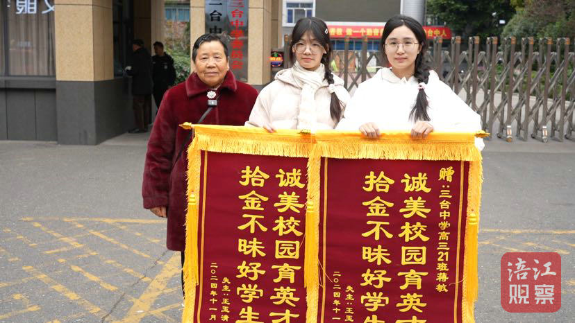 11月24日,三臺中學兩名學生拾金不昧,將撿到的包包完好無損地歸還給失主。為表達感激之情,11月26日,失主王玉清特意制作錦旗送到學生手中。[