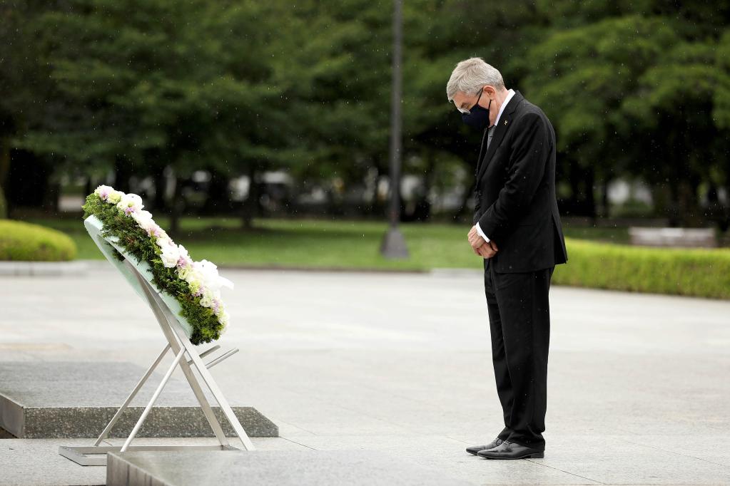 7月16日,在日本廣島和平紀(jì)念公園,巴赫向核爆慰靈碑獻(xiàn)花。[