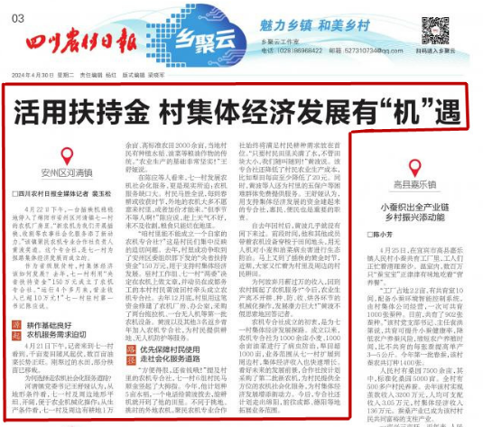 4月30日,《四川農(nóng)村日報》刊發(fā)《安州區(qū)河清鎮(zhèn) 活用扶持金 村集體經(jīng)濟發(fā)展有“機”遇》文章,聚焦綿陽安州利用“央省扶持資金”成立農(nóng)機專合社,為村民提供全方位的農(nóng)機社會化服務,為村集體經(jīng)濟發(fā)展增添新動力。[