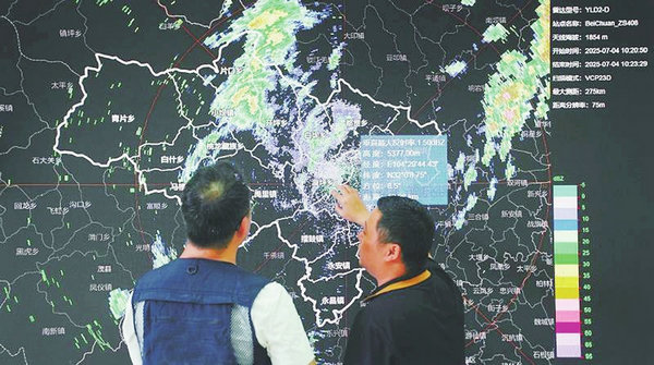 7月4日,在綿陽市北川防汛抗旱指揮部值班室,指揮大屏上實(shí)時顯示著全縣范圍內(nèi)降雨量。這些來自相控陣?yán)走_(dá)的數(shù)據(jù),成為防汛決策的重要依據(jù)。[