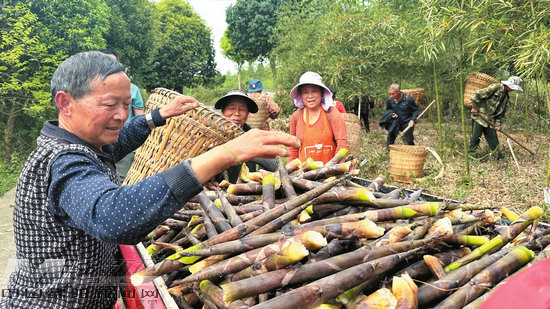 連日來,北川的山間竹林里,雷竹筍悄然萌動,鵝黃的筍尖破土而出,披著褐色筍衣。在永昌鎮(zhèn)新華村,村民們正彎腰忙碌,鋤頭起落間,一根根沾著泥土的雷竹筍被挖出,散發(fā)出春日的清香。[