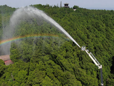 灑水降溫“向云端”,高度達(dá)45米,射程直徑最高達(dá)100米!這是8月14日,登高平臺(tái)消防車在綿陽(yáng)梓潼七曲山景區(qū)高空灑水對(duì)翠云廊古柏降溫增濕的一幕,現(xiàn)場(chǎng)蔚為壯觀。 [