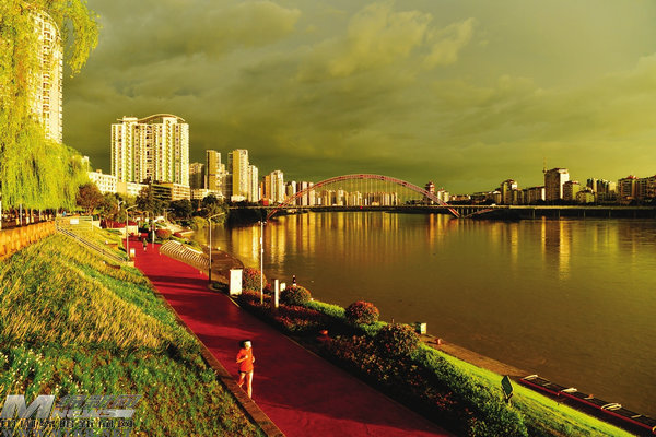 7月22日清晨6時許,隨著朝陽冉冉升起,霞光萬丈,把城區(qū)三江兩岸的樓宇、樹木、健身步道染上了一層金色,與短暫出現(xiàn)的彩虹相映成景,美不勝收。[