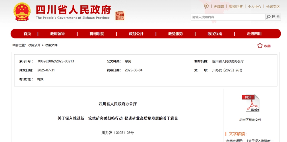 據(jù)四川省人民政府官網(wǎng)消息,為打造保障國家重要初級產(chǎn)品供給戰(zhàn)略基地,有力支撐國家戰(zhàn)略腹地建設,促進全省經(jīng)濟高質(zhì)量發(fā)展,近日,四川省人民政府辦公廳印發(fā)《關于深入推進新一輪找礦突破戰(zhàn)略行動 促進礦業(yè)高質(zhì)量發(fā)展的若干意見》(以下簡稱《若干意見》),提出6個部分,共18..[