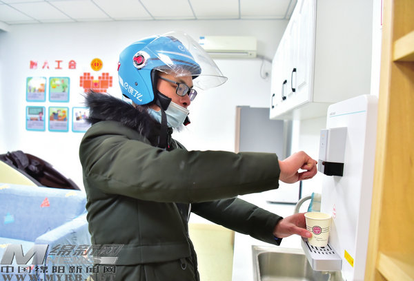 外賣小哥在休憩站喝水 綿陽(yáng)新聞網(wǎng)訊 “安逸得很,有沙發(fā)、微波爐、電冰箱,一應(yīng)俱全,非常方便。”1月7日中午,負(fù)責(zé)東津路路面清掃工作的環(huán)衛(wèi)工人林昌倫走進(jìn)“城市勞動(dòng)者休憩驛站”,打開壁柜,拿出紙杯,接了一杯熱水,坐在沙.. [