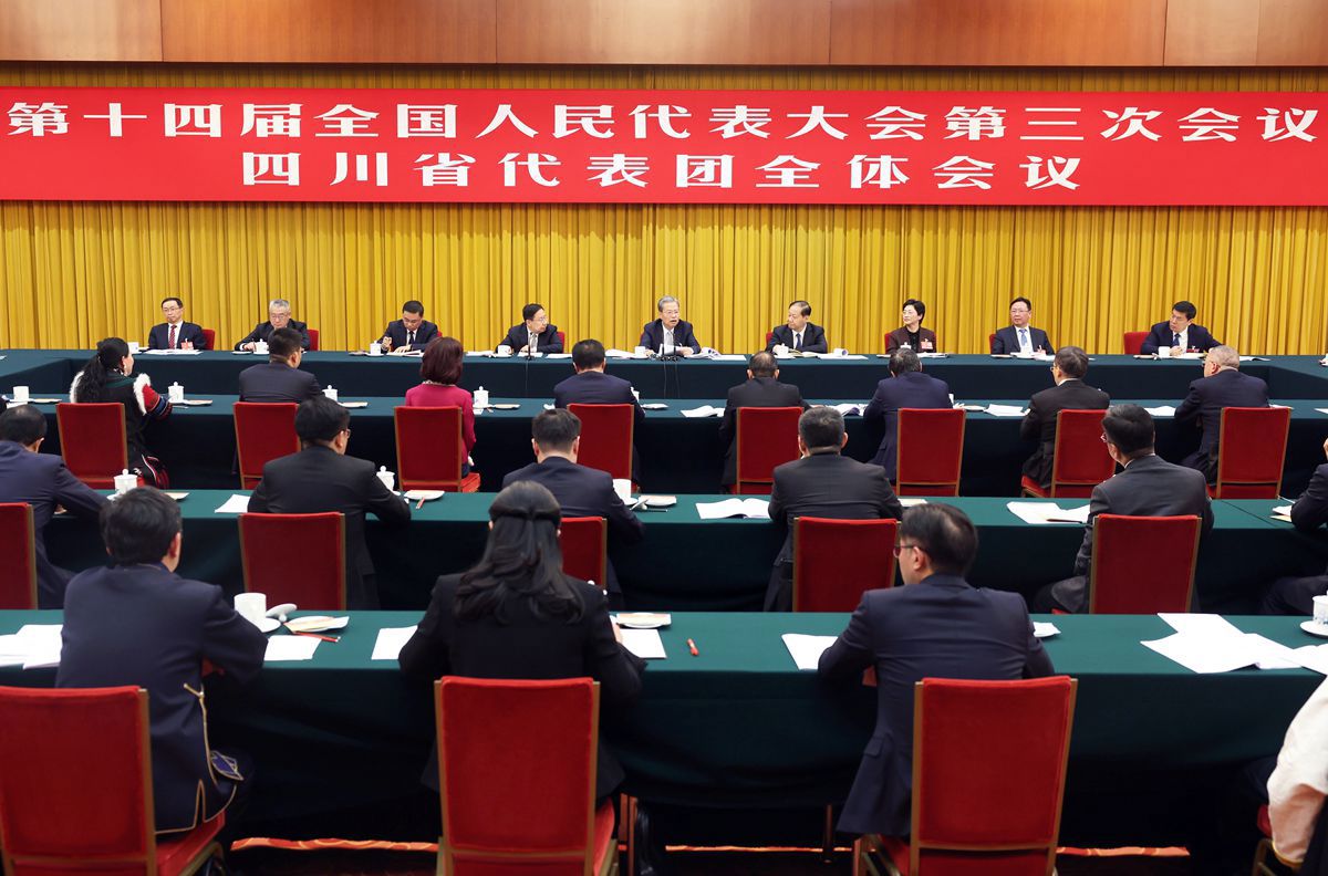 3月5日下午,出席十四屆全國人大三次會(huì)議的四川代表團(tuán)舉行全體會(huì)議,集中審議政府工作報(bào)告。 [
