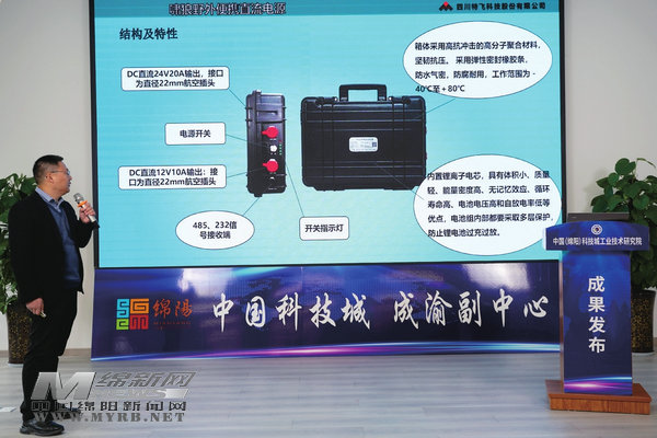 12月9日,中國(guó)(綿陽(yáng))科技城工業(yè)技術(shù)研究院舉行線上發(fā)布會(huì),發(fā)布了由我市企業(yè)——四川特飛科技股份有限公司研發(fā)生產(chǎn)的“便攜式移動(dòng)電源與氣象探測(cè)設(shè)備”成果。 [