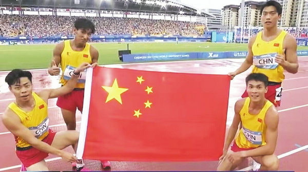 中國隊(duì)?wèi)c祝勝利,右上為鄧智艦。 綿陽新聞網(wǎng)訊 8月6日,成都第31屆世界大學(xué)生夏季運(yùn)動(dòng)會(huì)田徑項(xiàng)目男子4×100米接力決賽在成都雙流體育中心體育場舉行。最終,由綿陽選手鄧智艦等組成的中國隊(duì)以38秒80的成績獲得冠軍。 接力比賽,無疑是田.. [